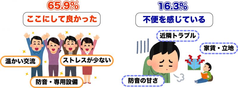 一方で、16.3%は不便を感じており、防音の甘さや近隣トラブル、家賃や立地の選択肢が限られる点などが課題に挙がりました。