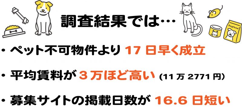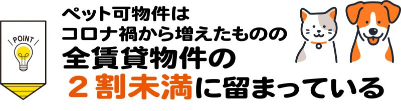 これによりますと、ペット可物件はコロナ禍から増えたものの全賃貸物件の2割未満に留まっています。そのため、配給不足から高賃料でも早期に埋まる傾向です。
