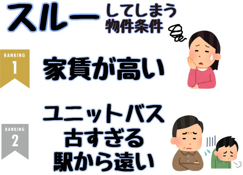 これによりますと、「スルーしてしまう物件条件」は「家賃が高い」が1位、次いで「ユニットバス」「古すぎる」「駅から遠い」が続き、経済性や快適性で判断する傾向が明らかになっています。